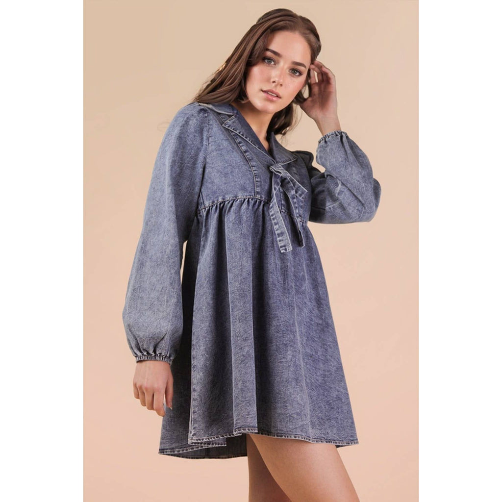 - Washed Chambray Collared Mini Dress - Front Tie - Long Sleeve