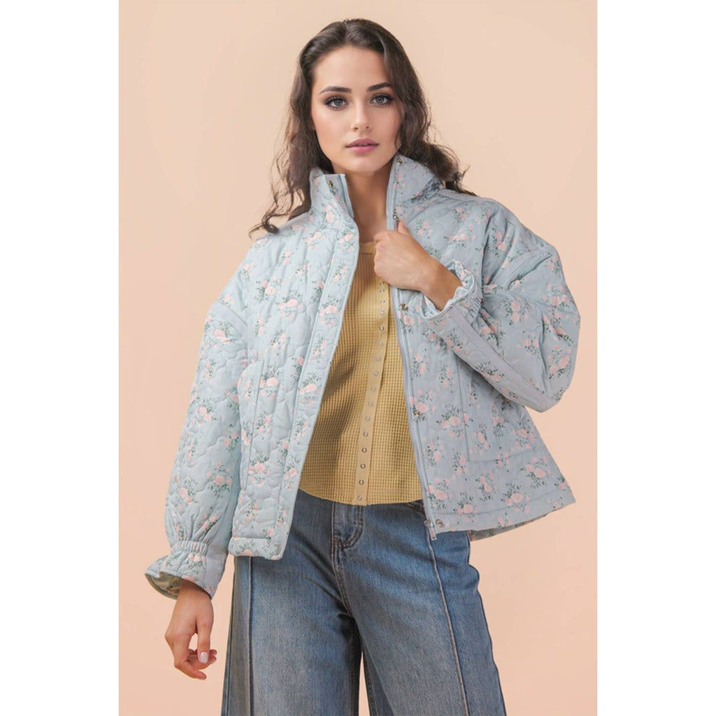 - Floral Print Quilted Oversized Casual Jacket - Button Down & Zip Up - Side Pockets - Mock Neck  100 POLYESTER