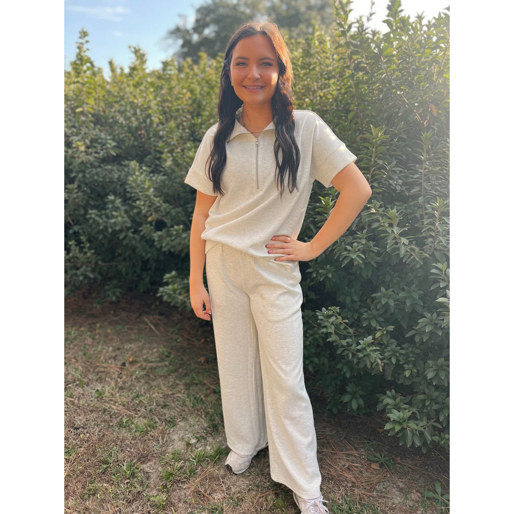 Cut from premium scuba knit fabric — soft, stretchy, and sleek — this set offers a smooth handfeel and structured drape that holds its shape all day. Wrinkle-resistant and breathable, it’s perfect for both lounging and on-the-go moments.