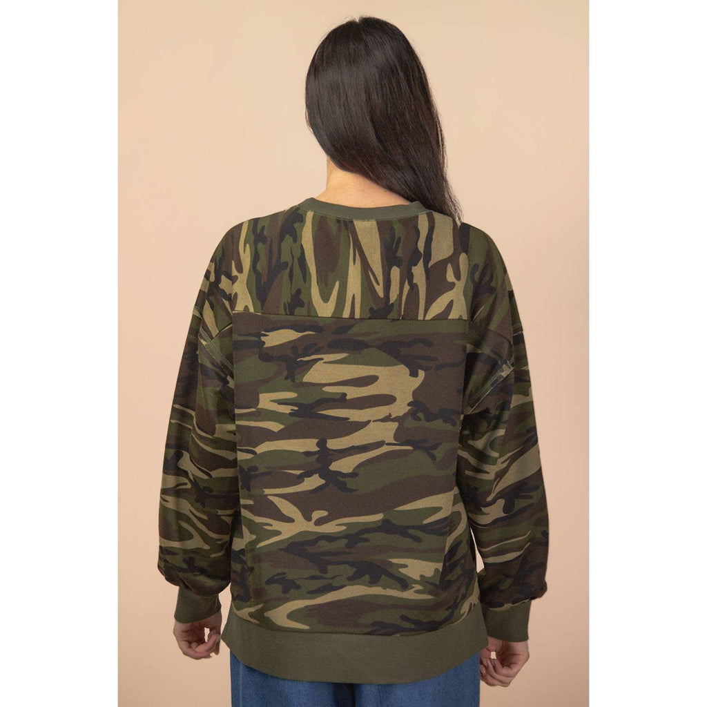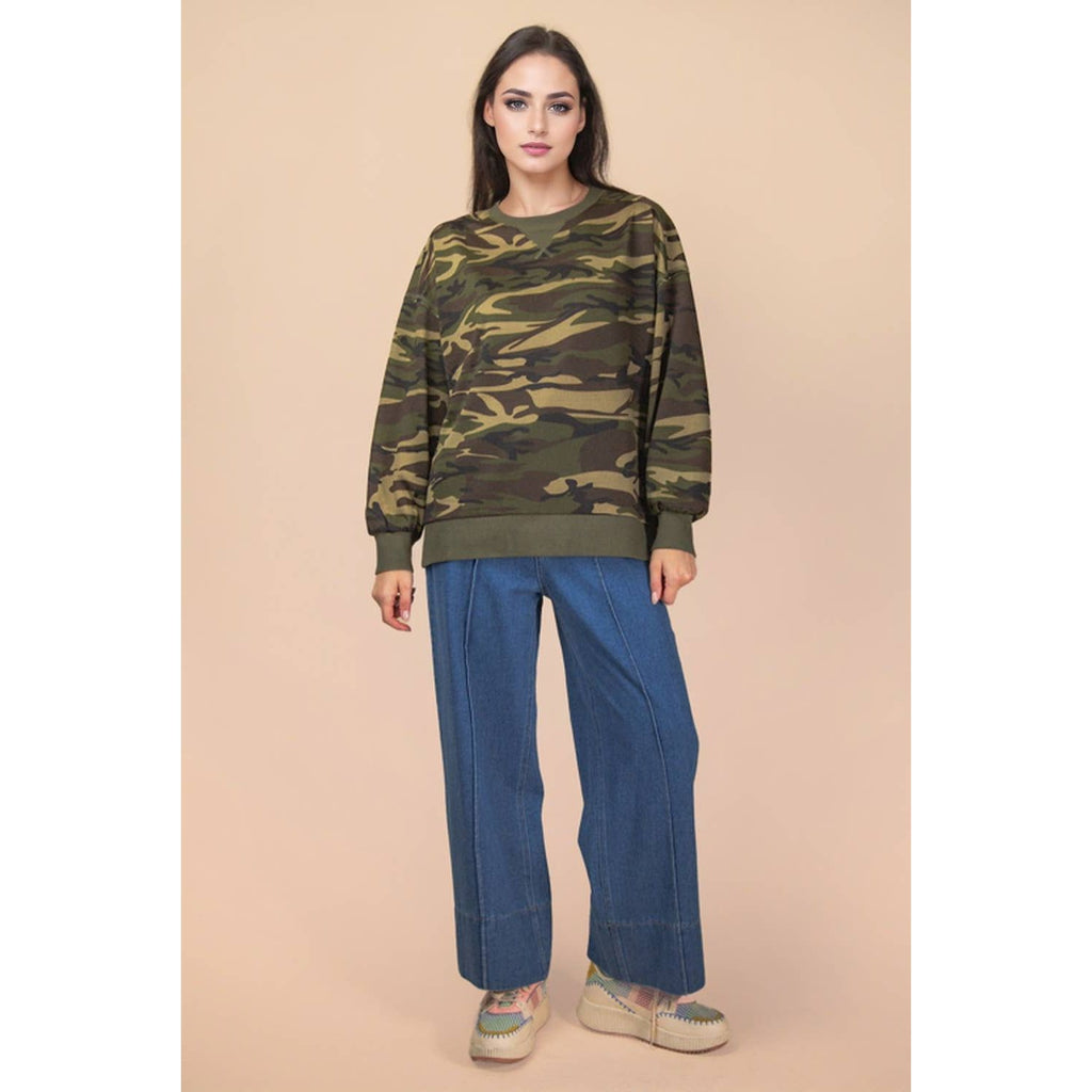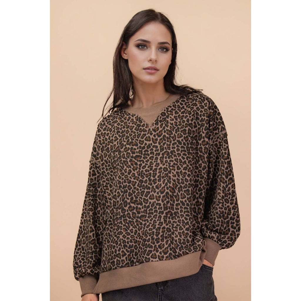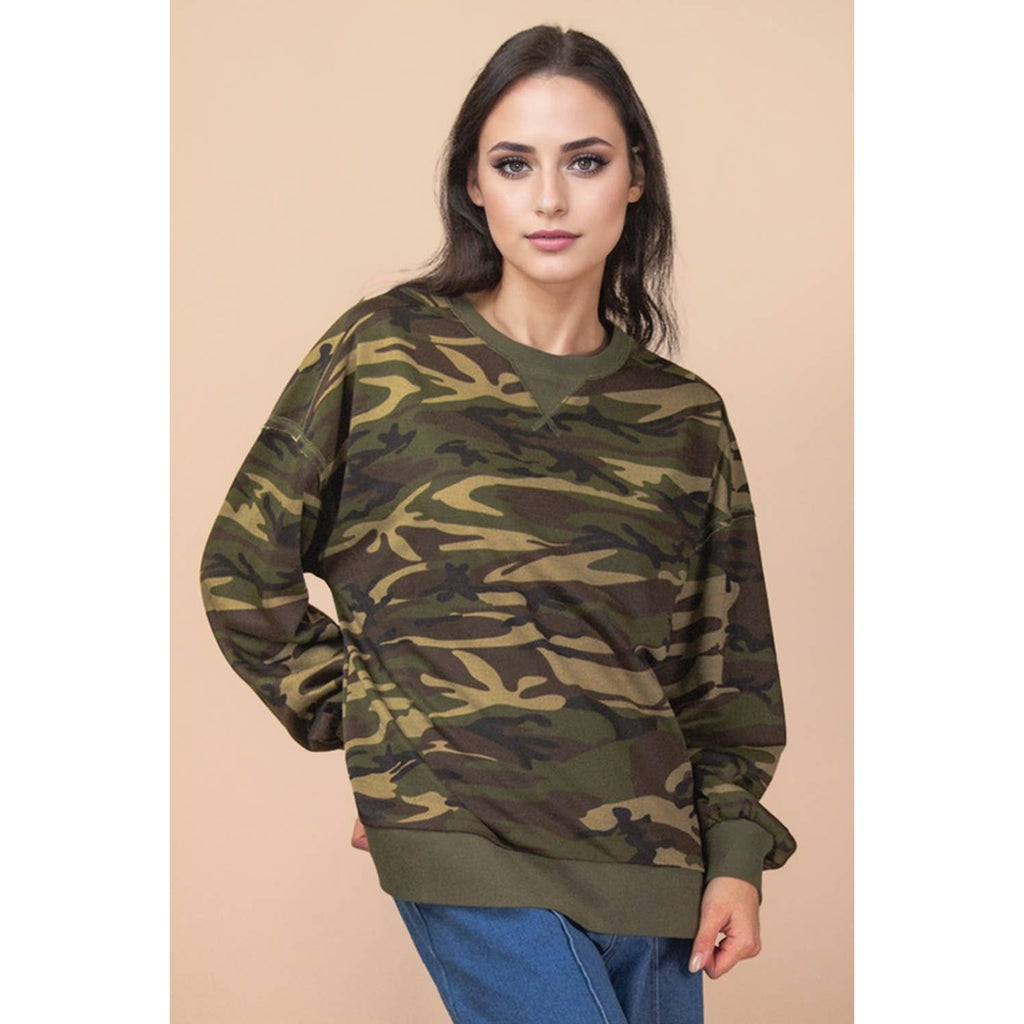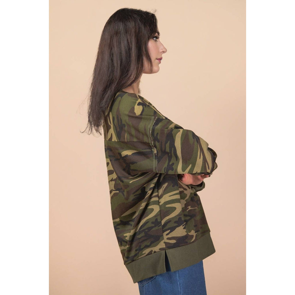 **PLUS SIZE Search for NT12318X** - Leopard & Camo Printed Knit Casual Top - Raw Stitch Detail - Oversized - Long Sleeve - Round Neck - Drop Shoulder - Side Slit