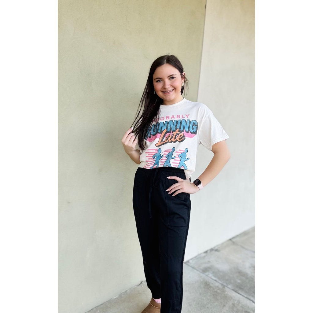 - High Waist Solid Knit Jogger Pants - Side Pockets - Elastic Waist - Waist Drawstring