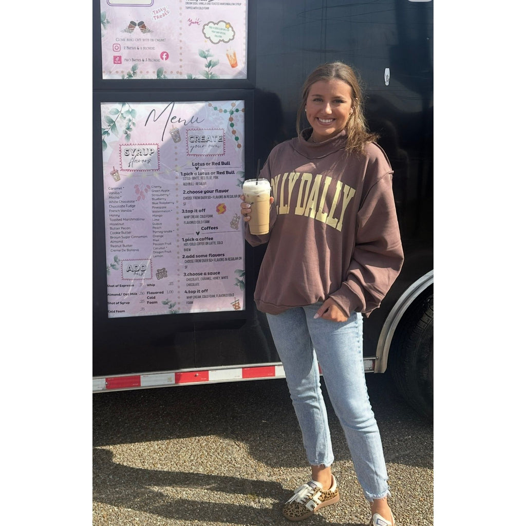 'DILLY DALLY' Print Reversible Mockneck Sweatshirt - Mock-neck - Drop shoulder, long sleeves - Softest cozy fleece - Oversized fit - Rib banded hemline and cuffs - The reversible design lets you switch up your style. - No print on reverse side