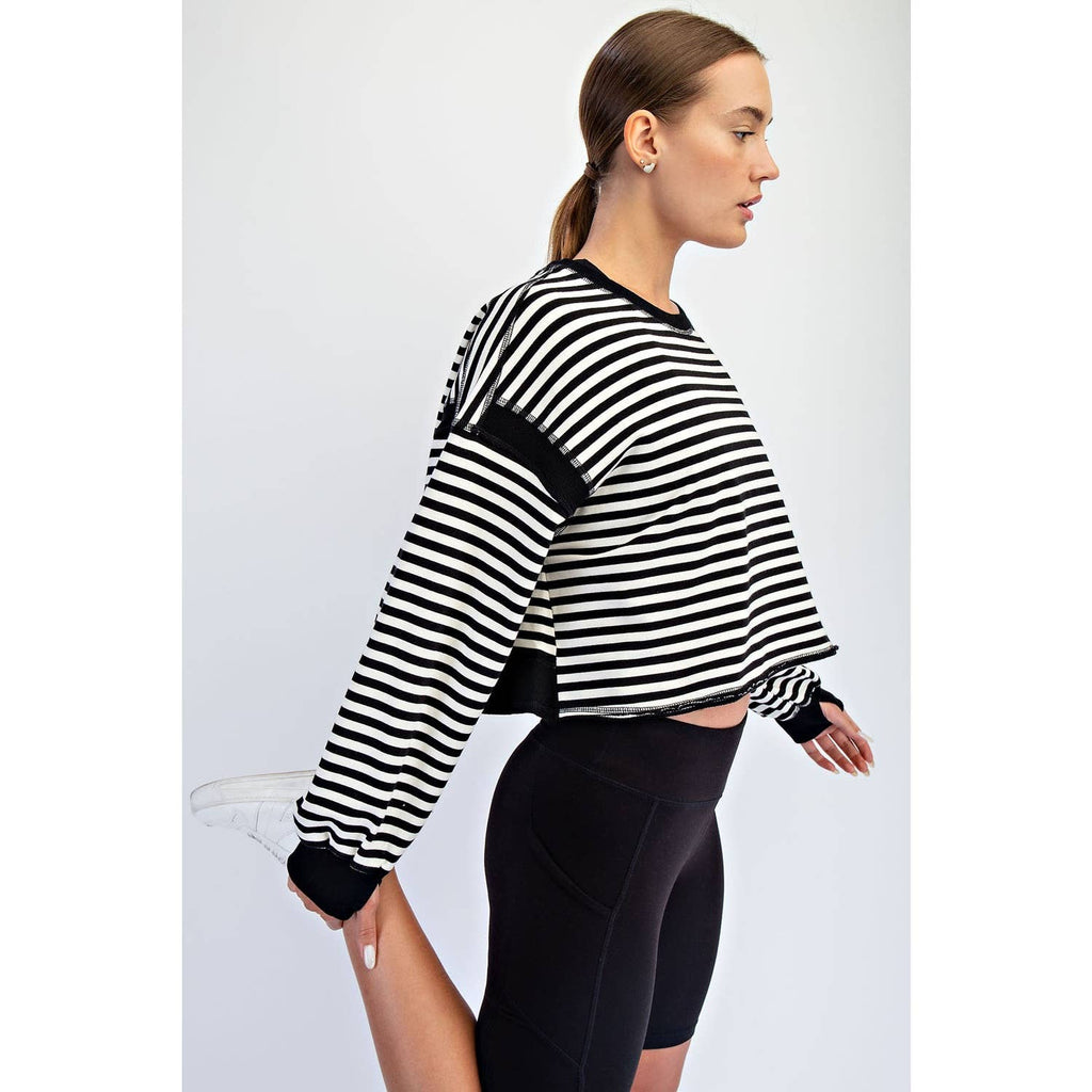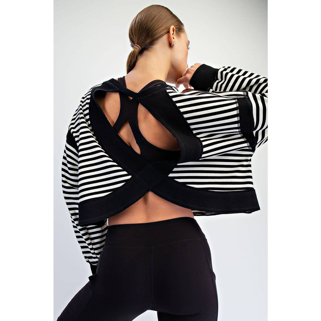 - Style No.: T0106 Unexpected and unapologetic. This striped top turns heads with its striking open back, exposed seams, and bold attitude. Designed to stand out, it's a statement piece that does all the talking—no effort required. Features: - Stripe yarn dyed French terry fabric - Relaxed fit / Oversized - Cropped length - Long sleeve top - Dropped shoulders - Wide round neckline - Open back - Pronounced seam details - Thumb holes details